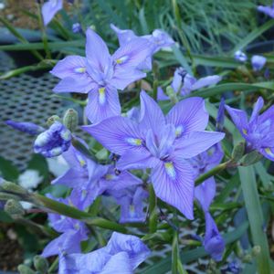 モラエア・ポリスタキア アヤメ科 南アフリカ原産 こんな鉢花が戸外で いっぱい咲いていました。 アヤメ科の花が今頃の季節に咲くのだなと不思議な感じがしました。 GSのタグの花たちを見ていたら、冬に咲く貴重なアヤメ科の花だとか・・・。