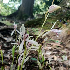 マヤラン ラン科シュンラン属 絶滅危惧Ⅱ類(VU) 関東から九州までの常緑広葉樹林や古い二次林に生える菌従属栄養植物(腐生植物)である。 和名はこの種が初めて発見された神戸市の摩耶山に因む。 花期7〜10月 根茎は長く地中を這い分枝する。 緑色の茎を10〜30cm伸ばすが、緑葉はなく、茎の下部に鱗片葉が数個付く。 花は茎頂に1個〜数個咲かせる。 萼片、側花弁ともに長さ2cm、幅1cm弱で白色である。 萼片の中央部には赤い筋があり、側花弁は周辺部を除き、赤い模様がある。 初めて見ました。赤と白のコントラストが綺麗でした。