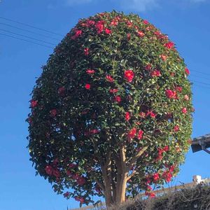 ネタ切れで、余計なものが写り過ぎなpicですがアップさせてもらいます🙇♂️街路樹のツバキが玉造りに剪定されて青空にGSバエていたので📸してきました! 16日(木)午後のpicです😊 余計なもの: ガードレールのアタマ、 右の何か判らない黒いヤツ、 電線 が、無ければ良かったのに、、、😵