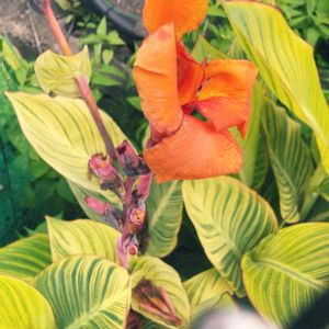 コンビニの横の空き地に植えられてる カンナの花です❣️ この葉っぱの模様が面白くて📸撮って来ました‼️ 葉芸が凄すぎる〜✨✨✨ 少し葉っぱを齧られてるのは許してください😞 小学生の低学年くらいの大きさでした! 去年もアップしたと思います😄 後日偶然にベンガルタイガーという品種だと判明しました!