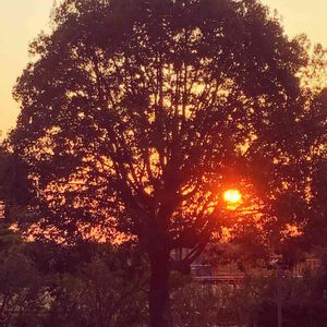 早朝散歩 5:47 気持ちのいい空気と日の出☀️を堪能させてもらいました! 大きな木の影を透かして光りが差し込んで来て綺麗に見せてくれました❣️