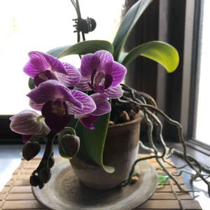 キッチン出窓のミニミニ胡蝶蘭です❣️ 今日で花が6個目まで咲いてくれました! 蕾は5個、残ってます。なんとか残りの蕾が全部咲いてくれるとウレピーです☝🏻 途中で蕾が増えたので計算が合わなくなってしまい少し混乱しましたが、現状報告。