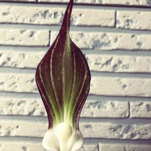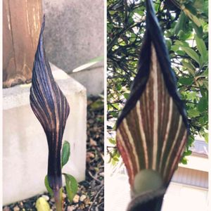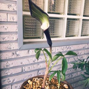 夕方近くに庭の花を鉢上げしました❣️ 可愛い〜いヤツですよ☝🏻 テンナンショウ属のユキモチソウです❣️ こんなユニークな姿はなかなかないよね〜 玄関脇の花台に乗せました。 昨日庭で後ろ向きに咲いたので今日鉢上げしました! 少しヘソ曲がり? 今朝見たらこの子のすぐ横に芽が出てて 葉っぱ🌱が似てると思ったので掬い上げて同じ鉢にあげて玄関脇に置きました❣️ 電気灯と雪餅の灯りの共演?競演? 今夜の見張り番でーす😄