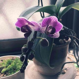 キッチン出窓のミニ胡蝶蘭です! 2輪目の花が開きました🌺 残り8個の蕾が残ってます😊 無事に全部咲いてくれるかなぁ〜 横の小ちゃいカップのは花友さんと物々交換したクラマゴケです☝🏻