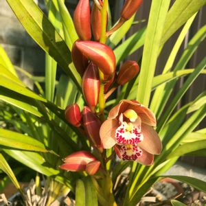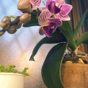 12月に花芽を出したのは、フェイクだったけど、新しい花芽を更新してくれてうれしい❗️ お隣りさんからもらって1年経った鉢植えのシンビジュームです😊 雑草駆除のアドバイスしてあげたら喜んでこの子をくれました!