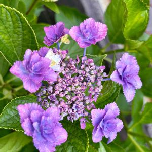 紫陽花たちもそろそろ終盤を迎え… ①モナリザ 最後の蕾が咲きました。 ②雷音 花冠のように形よく並んでいます。 咲き始めより少し時間をおいた方が色が馴染んできれいな気がします😅 ③ロイヤルキング これも時間が経つにつれて深い色になってきました。 ④コンペイトウスマイル …ピーターパンと見分けがつかないかもしれない💧 ⑤深海の色 この紫陽花は両性花の色も濃くて好きです。