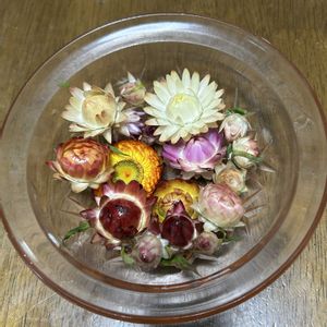 麦わら菊、茎がすぐ弱りますが、お花だけドライフラワーのように長持ちするのでお皿に乗せて楽しんでます😊