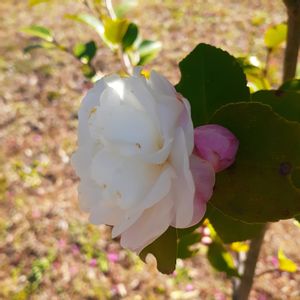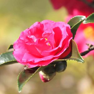 シナモンシンディ 米国で交配された椿 蕾はピンクで花は鴇色(ときいろ) シナモンのような微香がすると言うけれど、風が強いからか香りはありませんでした