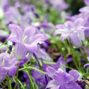12月13日 今日のお花『オトメギキョウ』です。 【オトメギキョウ(乙女桔梗・ベルフラワー)】 クロアチア原産、キキョウ科多年草。 小さな濃い緑色の葉を多数つけ、茎は根元から密に枝分かれする。それぞれの枝先に1〜数輪の花をつけ、花は直径約2cm、釣り鐘形で上向き、あるいは斜め上向きに咲く。 草丈:10~15cm、開花期:4月~5月、花色:紫・白 北九州市立総合農事センターにて。