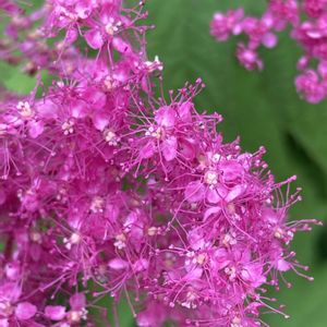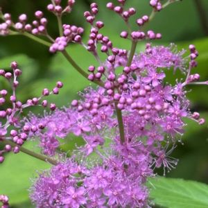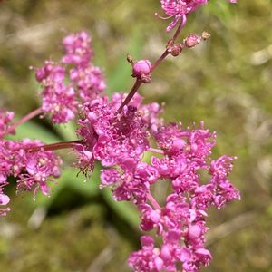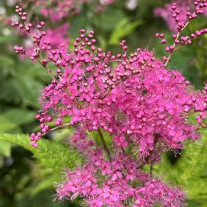 キョウカノコ、シモツケソウ、シモツケ🌸🌸🌸🌸🌸 1️⃣2️⃣キョウカノコ(京鹿の子) 京鹿の子 バラ科 シモツケソウ属 5/27撮影 粒々の小さな蕾が開くと、ふんわりと煙るような花房に。 名前の由来は京染めの鹿の子絞りで、古くから茶花として親しまれてきた花であるが、日本の自生の記録はなく、日本で作出された園芸品種ではないかと言われている コシジシモツケソウとシモツケソウの交雑種で花期は早い(6〜7月) シモツケソウと花がよく似ていいるが、葉はどちらも手のひらの様な形で、京鹿の子の方は切れ込みが深く、縁のギザギザが多い、茎の分かれ目の棘がないがシモツケソウにはある また、托葉がキョウカノコは尖っていて、シモツケソウは丸くつく どちらも草になります 3️⃣4️⃣シモツケソウ(下野草) 2024年8/15標高1300mあたりの高山で撮ったもの 地面近くで咲いている 5️⃣シモツケ(下野) シモツケ属 花がより一層密集している 葉の形はキョウカノコやシモツケソウとは違い、披針形 落葉低木である 5/27撮影 三つの花は似ていて区別が難しいけど、実際に目で見て何となくわかった様な❓ 個人的にはキョウカノコが好きです❣️