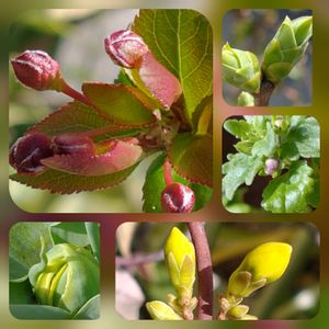弥生三月 春ですねぇ 我が家の蕾たち 左上 海堂 左下 チューリップ 右上 ライラック白 右中 バラ咲きバコパ・スコーピア 右下 カナリアジャスミン もう、すっかり 春の準備オッケ~✌️
