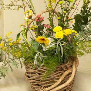 横長花器に生けた椿🌺🌿と オオキバナカタバミ💛☘️ 展示会場前の花壇