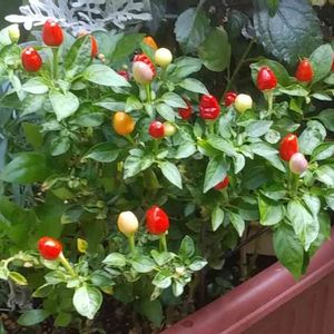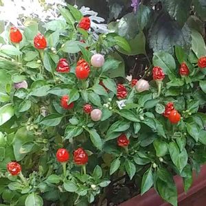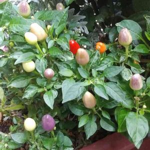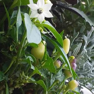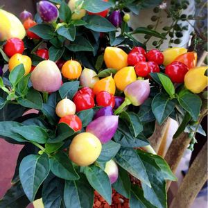 ゴシキトウガラシ(五色唐辛子) ナス科 観賞用の改良品種で、色が段々と変化していき、 この品種は、色が紫→白(クリーム)→黄→オレンジ→赤の順番で変化します♡ 今の色だけでいいんだけどなあ♡ まあ〜色んな色を楽しんでまたパチリしてみます˙˚ʚ( •ω• )ɞ˚˙ お花が小花で縁取り可愛いです꒰ •ω• ꒱゚+。:.゚ஐ♡