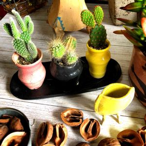 これも兄貴が作った鉢、ちっこー💦 で、割れるのも悲しいしと飾ってあったミニチュアの鉢❣️ 普段、大きいものばかり植えてるし、腱鞘炎には細かい作業、手がぷるぷるしちゃいますが思った通りのサイズのサボちゃんがあったので嬉しい😃