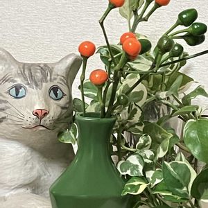 旅先の市場でぶら下がっていたハリボテのこの子と目が合って スーツケースに入れて持ち帰ってから数十年、私のお守りの様な子(実はもう一体あります) 今日も見守り隊してます お気に入りの緑の花瓶には唐辛子 斑入りポトスは水にさしていますが 多分5、6年は経っていると思います(強い!) 昨夜は冷えると言うので少し厚めの夜具をかけましたが 暑くて蹴飛ばしたのか 夜中寒さに震えて目が覚めました 皆様も気をつけてくださいね♪
