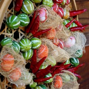 🇯🇵 長野県妻籠宿にて、とてもお洒落な飾りを見つけました😳👏👋👋👋👋。 スズメウリ、トウガラシ🌶、赤に白い模様の入った実は何だろう??