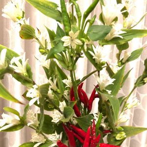 白花のホトトギスと赤いトウガラシ❣️ 色のコントラストにメロメロ😍 アンテナショップで100円💕 お値段も👍 トウガラシの花は白色^ - ^
