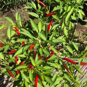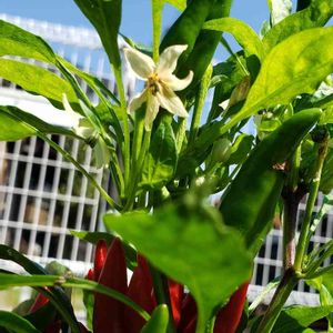 今日も暑かったね~。 暑いときは熱いものを…ね! わかる?唐辛子の花と熟した🌶️と出来立ての青い唐辛子。