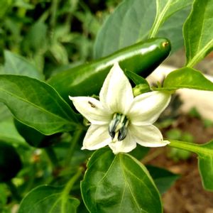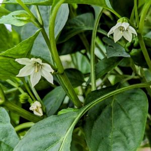 今日のお花 🍀トウガラシ ナス科 トウガラシ属 唐辛子の花色は白色 グリーンの実ができて 赤く色づくと完熟 唐辛子に!