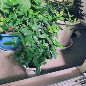 今日のお花💐のクチナシさん(中央)です。 今日は咲いてません😂。今年うちに来てから、1輪だけ咲きましたが。 北側の日陰になるベランダが気に入ったのか、新しい✨️🆕葉っぱ🌿がわさわさ出てきています。 並んでいる青じそさんやレモンバームさんもふさふさになってきたので、お互いに日光☀️を遮らないように鉢の間を開けてあげました。