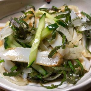 先程の育ち過ぎたキュウリは酢の物に。 皮を所々ピーラーでひいて千切り。 わかめ切らした〜笹かまでいいか? 玉ねぎスライスして青じそ刻んで ご馳走酢の物グーでした👌😋