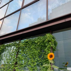 おはようございます😃 刈谷市役所近くの高層ビルです。 一階の窓にゴーヤの緑のカーテンです。 下の植え込みから伸びて、黄色い花が咲いています。 最近、朝顔よりもこのグリーンカーテンをよく見かけます。 実も小ぶりですから、邪魔にならないし、炒めて食べれば美味しいですから。😁
