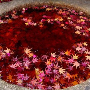 石光寺(奈良県葛城市)の境内にあるつくばいの紅葉 モミジの色が水に移ってました。