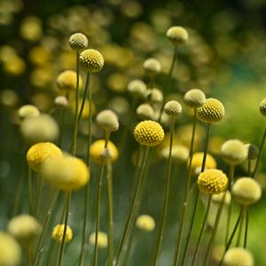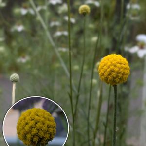黄色🟡💛の まる〜い子 『クラスペディア グロボーサ』 種まきから育てると… めっちゃ可愛い〜💛 バックの白い花は、 零れ種からの ニゲラさん✨