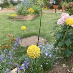 nami's gardenの🏡 ポンポンたち🍃🟣🟡🟢🟣🔴🌿 pic①ヘリクリサム・ルビークラスター💓 pic②アリウム 'カエルレウム'💟 pic③クラスペディア グロボーサ🔆 pic④スカビオサ(松虫草)💗 pic⑤クレマチス・マズリーの蕾🟢🍃 ぽんぽんと丸い🟣🟡🔵⚪️ アリウムが🌬️🟣🔵🟢🌿 風に揺れてるお庭が🖼️🏡 夢でした😴💭 一昨年🗓️🐇昨年🗓️🐉 かなりの数の🔢🕳️🕳️🕳️ 球根を植えたけど🧤🌰🧄🌰🧄🧄🌰🧤 1️⃣2️⃣3️⃣4️⃣………🧐⁇ 数える程しか🔍👀 咲いていません😢クスン だけど…🤭 とりあえず😮💨 咲いてくれてありがとう🤗💞