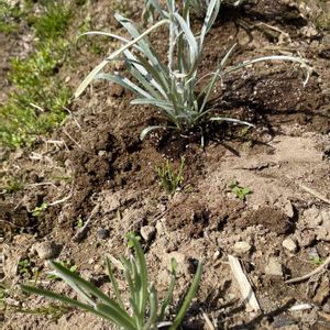種から育てた苗を植え付けました。 手前はダメ元で秋に植え付けたもの。なんと雪を乗り越えて半分ぐらいが生き残りました! 小さいけど緑が濃いですね。 奥はこの日に植え付けたもの。冬の間暖房の効いた室内で育てたので、大きいけどシルバーリーフになっています。