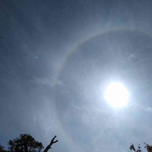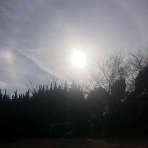 ゴルフ場⛳️🏌️♂️で見つけたこの光学現象! 太陽の周りに大きな環ができているのが分かりますか。これが「ハロ」と呼ばれるものです。空を見上げているとたまに太陽や月の周りにもできることがあります。 よく見ると環の左の方には虹🌈ができています🤗