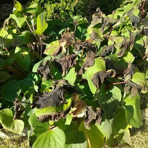 サツマイモの葉が氷点下によるダメージを受けたみたいです。 いよいよ収穫ですね🍠 霜よけハウスにデージーなど全て移動しました。冬将軍いつでも来いや〜💪