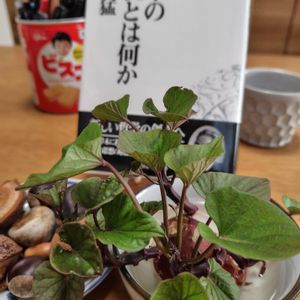 11月3投稿目 変則投稿…ちょっとわざとらしいアングル…実は本を読んで感じた事を記録しておきたい…。 「日本の伝統とは何か」梅原猛著…ずっと積読になっていた本をパラパラっとめくって目にとまった箇所…。 日本人の精神性を形作るモノ(ストーリー、原型)への考察を本質をついた凝縮した形で見せてくれる一冊。 その中で私の気付きというか、新たな知見となった箇所は… 私の鉱物への感性って…いわゆる“エネルギー”を感知出来る感性を持っていた頃(古代…縄文とか)の名残がDNA🧬として私の中にあるのだと常々思っていましたが…この梅原さんの本の中で、日本の天台仏教では成仏出来る衆生を動物だけでなく草木(植物)や鉱物(国土)まで範囲を広げて考えていて、インド仏教では動物までが衆生なのだ、と。仏教は途中から入ってきた外来の宗教ですから…それを取り入れる時点でも日本人は自らの感性をそこに反映させていたんだな…と。 この感性はやはり世界共通なのではなく地球上のある特定の人達(ネイティブアメリカンや島々の人達等も)のものなんだなと思いました。それが仏教にも反映されているんだな…と。 様々な生き物が持つ感性がどういう環境を得てどの様に形作られて来たのかという事に時折ググっと惹きつけられてしまうので、自らの感性のルーツ等も気になったりするんですね〜。 しかしこの梅原さんの本は凄くエッセンスが凝縮されていて中身濃ゆくてびっくりです。梅原さんの本は20代の頃から目にとまっていましたが、その難しさ故集中して読み切る事が出来ず、更に私の脳ミソが最近はそういった時間を拒否しているので中々読み進められませんでしたが…頑張って読んでみたいな…。 ちなみに手前の植物は水につけたサツマイモとその芽です。栄養分があるので芽が生き生きと成長していってそれを見ているだけでちょっと喜びがあるのです。植物可愛ゆし、ですね〜😊🍀