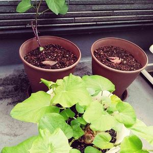 夏の終わりに芽の出たサツマイモを植えてみました。 実は無理だろうけど芋づるは食べれそう( ╹▽╹ )
