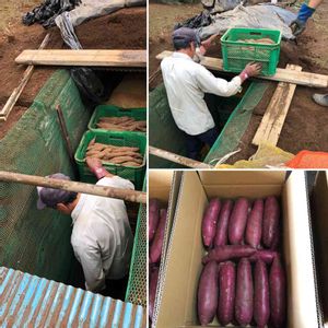 (左)昨年の11月に収穫したサツマイモは畑に掘ってあるこの穴に貯蔵しておきます。半年以上経過してやっと出荷です。 (右上)コンテナ4つずつ積んであるのを1つずつ出していきます。 (右下)手で1本ずつ私が洗い、箱詰めは夫です。これは、Lサイズのお芋です。7月1日で出荷も終わりました。