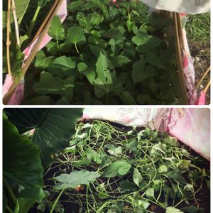 ツルとり用の苗だったので、 ダメかな?と思って試し掘りしました。 一応おイモ🍠が育っていました。 ホント? ただの種芋じゃないのかな? とちょと疑念はあるけど、 夫が茹でにかえっていきました。 楽しみにじゃあ(*´ω`*)