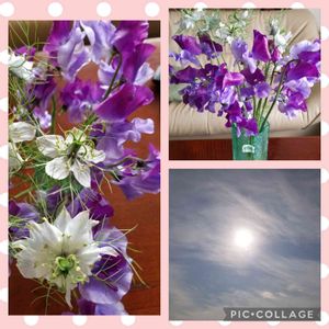 華やぐ仏間に かぐわしい紫色 春を呼び込み (紫二色のスイートピー、ニゲラの切り花) 右下…ハロ見っけ! 🏷乙女色クラブ