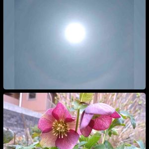 昨日春霞でしたが、薄くハロが見えました 太陽の前を飛行機✈️が飛んでいます 可愛らしいオキザリスも