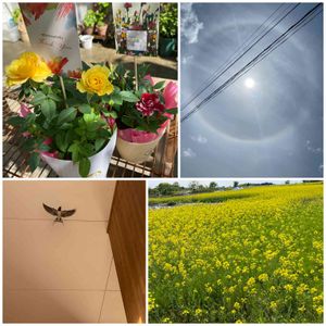 ㊗️母の日🙌 黄色のミニバラは黄色好きな実母へ💛 マーブル模様のミニバラは義母へ❤️ 実母へバラを届けて帰り際、鳥のサギか飛んでいたので空を見上げると、☀️の周りに虹色の🌈輪っか(ハロ)が✨✨ 母は72年生きてきて初めて見たと感動してました🥰 2人で健康のためには姿勢は大事だよねと話していた瞬間でした✨ その後、帰宅して近所の菜の花畑とハロを一緒に撮りたいなと思ったけど、難しかったです😅 最近GW中、ツバメがうちの玄関に巣を作ろうと 内覧会にきていました😍 でも今日はほとんど来ず… ぴえん🥺 巣、作って欲しかったな…😢