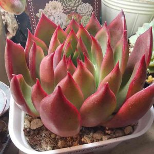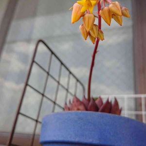 我が家のエケベリアは、現在4/5がベランダ組(夜間は遮光ネット何重重ね、ビニールかけ)、残り1/5が真冬限定の室内管理組。 ベランダ組は一年中ベランダということになる。 全てベランダにしたいが場所の問題とベランダと室内管理の差があるか試したいというのもあるから分けた。 とはいえ、室内管理組も1月上旬まではベランダ生活していた。 エケベリアは水を切って、夜間の寒風・雨防ぎさえすれば冬は問題無さそう。 梅雨と真夏の方が厄介。 下葉の消耗が激しい(今年は遮光と雨に当たるのを調整する)。 寒さに関しては、去年の2月辺りにベランダに出してエケベリア2点くらい調子を悪くさせたが、それは寒風・雨防ぎが甘くて、寒さ&雪、雨で濡れて傷んだのが原因だと思う。 何もしなかったわけではないが、雨の時にビニールを被せたくらい。風で飛ばされたり、外れるから結局濡れたけど💦 今年は雪・雨が少ないから助かっているし、寒風対策しているから余裕に感じられる。 我が家のエケベリアのほとんどが1年以上経過しているから環境に慣れたというポジティブな捉え方もしたい(無理矢理感)。 写真は室内組。 ルブラ、ストロベリーアイスに花芽が2、3つ出てきている。 一度に3つなんて去年いたか記憶に残っていない。 ベランダ生活組にも花芽が出てきているから ベランダと室内組で差は無いようだ。 ただ、このストロベリーアイスが一番花芽の成長が早いかな。