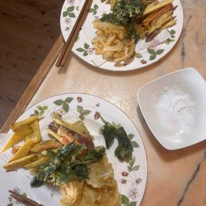 天ぷら 野菜不足を補うべく、天ぷらに。 お隣さんへは(息子さんがきて居るから、2人分) これから天ぷらするけど要る? 20分待ってねと、揚げたてをお届け。 庭の大葉穂紫蘇、 さつまいも、人参 (通称がねあげ) 姿が蟹に似て蟹のことをがねと 玉葱、 メークイン 焼き塩