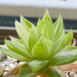 🪴ハオルチア属 京の華錦(斑ぬけ) うわ……て引いた元気の良さ 緑ばっかやし斑が抜けちゃったんかな🤔 ちなこの子が一番の古参。ラ・ムー産