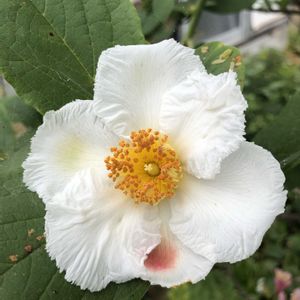 葉の付け根に 直径5~6cmほどの 白い花を上向きに咲かせる 花びらは5枚で 縁には細かなシワがある 夏椿(なつつばき) 別名 沙羅(しゃら) ツバキ科 落葉小高木