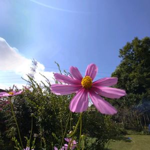 こんばんは🌜 コスモスと青空🌼 虫取り網、放置されてる💦