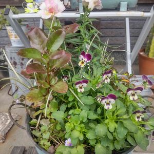 キンギョソウの寄せ植えの脇役 コプロスマ2種類は買ってきた コロセウムアイビーは庭にこぼれ種で生えてたのを引っこ抜いた アジュガもあちこちはびこってるので鉢の隙間に良い感じに
