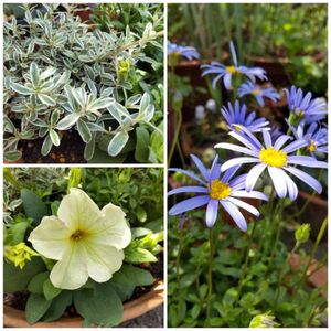 ブルーデージーが可愛かったのでペチュニアと斑入りのコプロスマと寄せ植えしています
