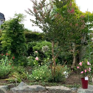 おはようございます☁️ 居間からの眺めです❣️ なんでも見えるところに植えたいから 密々状態Σ⊙▃⊙川 ノアヒャンさんから頂いた🌹✨ メルヘンケーニギンも元気になり 咲いてきました(๑°꒵°๑)・*♡ 百日紅も、つぼみが膨らみ始めましたが 雨と低温で、うどんこ病っぽい😢