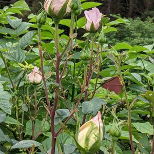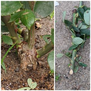 昨日You Tubeで色々調べて夕方メルヘンケーニギンのぶっといベイサルシュートと、真ん中に伸びてる枝、サイドシュートの3本除去しました。私の親指より太いシュートがワンサカ直立し、ピンチしても太いまま伸び、箒状に蕾をつけてるので困ってました😓余計なシュートや、細すぎる&太すぎるはよい花をつけないので根本からカット。栄養が余るとまたシュートがでてくるからまた様子をみてカットの繰り返しで木のバランスをとって冬の剪定にもっていくそうです。シュートは大事だけど、バランスをみないといけないそうです😅
