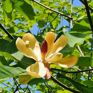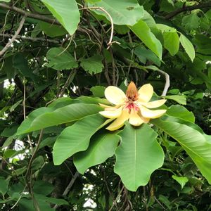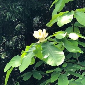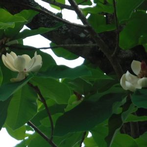 家の裏山に朴の木の花が咲いています。 かなりの高さで、上手く撮れません。 クリーム色の大きな花がおもしろいです。