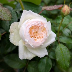 おはようございます。 全国的に雨模様みたいですね☔ 秋の白バラ、ボレロです🌿 濡れた姿も美しい✨